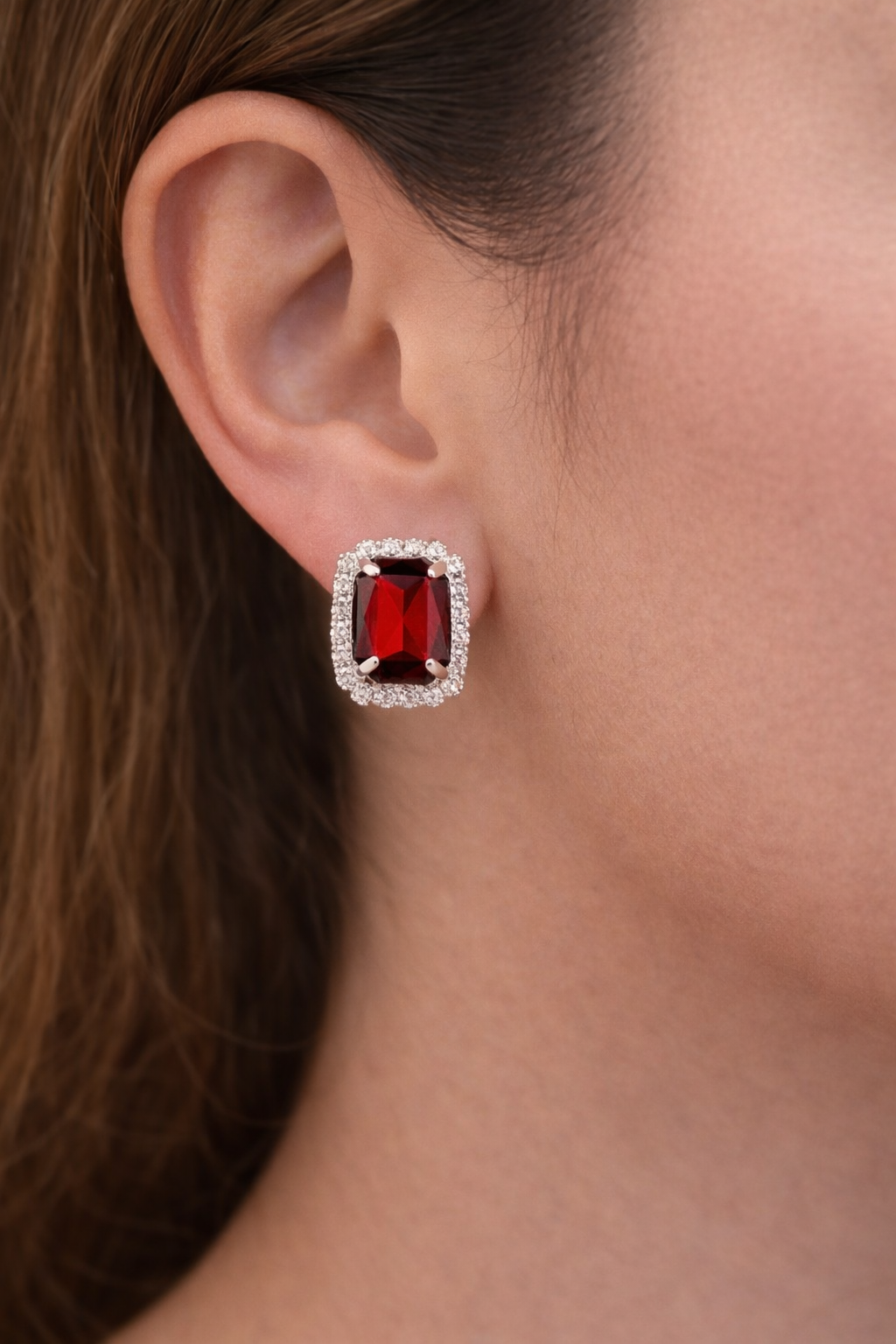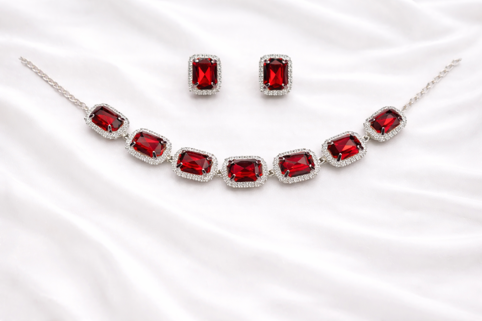 Make a bold and elegant statement with this stunning ruby-red halo necklace set. Featuring radiant rectangular-cut stones in a deep crimson shade, each piece is surrounded by delicate shimmering accents that enhance its luxurious appeal. The sleek silver-tone chain sits beautifully along the neckline, while the matching stud earrings add a touch of refined sparkle. Perfect for weddings, festive celebrations, evening parties, or special occasions, this set brings timeless glamour and confident style to any outfit.