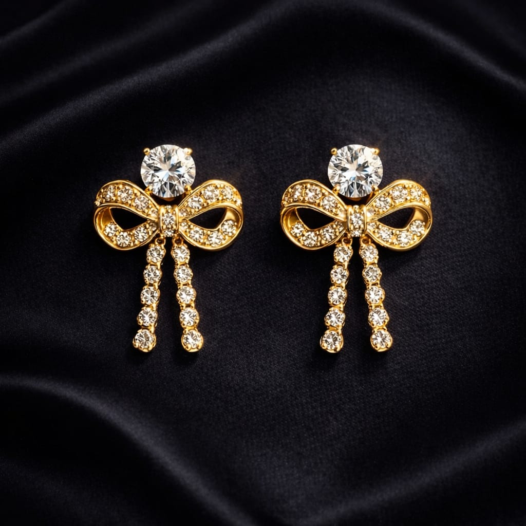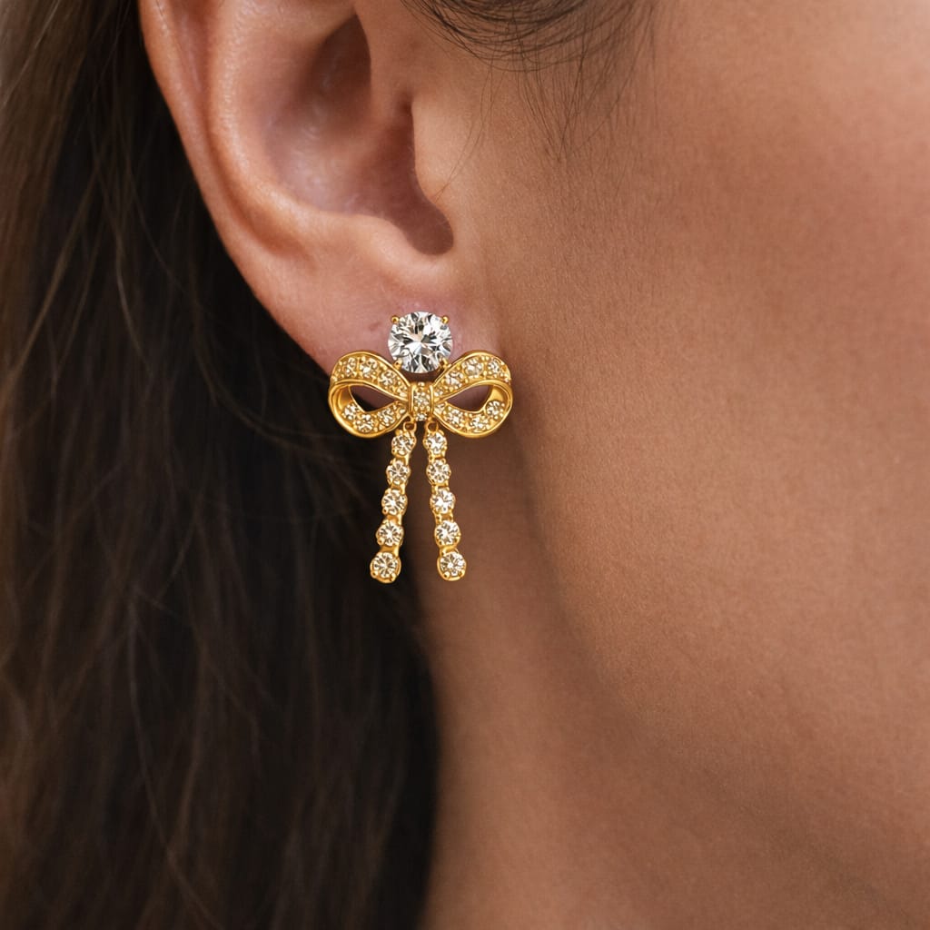Crafted to elevate both everyday looks and festive outfits, these earrings offer versatility with a luxe finish. The bow drops bring graceful movement and statement shine, while the triangular studs create a polished, minimal aesthetic perfect for layering or solo styling.