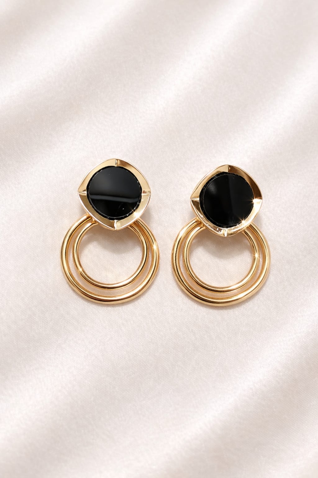 The upper earrings showcase sparkling crystal studs with finely detailed black and gold wings, while the drop earrings are designed with a soft pearl enclosed in a sleek, diamond-inspired frame. The combination creates a balanced look that feels elegant yet contemporary.