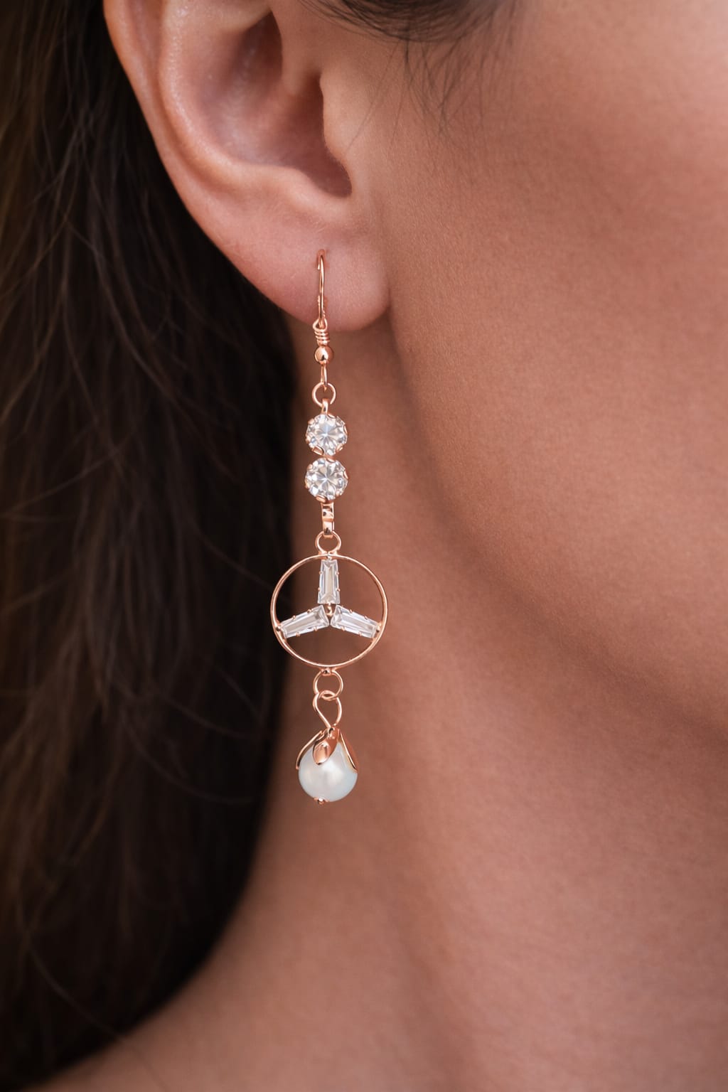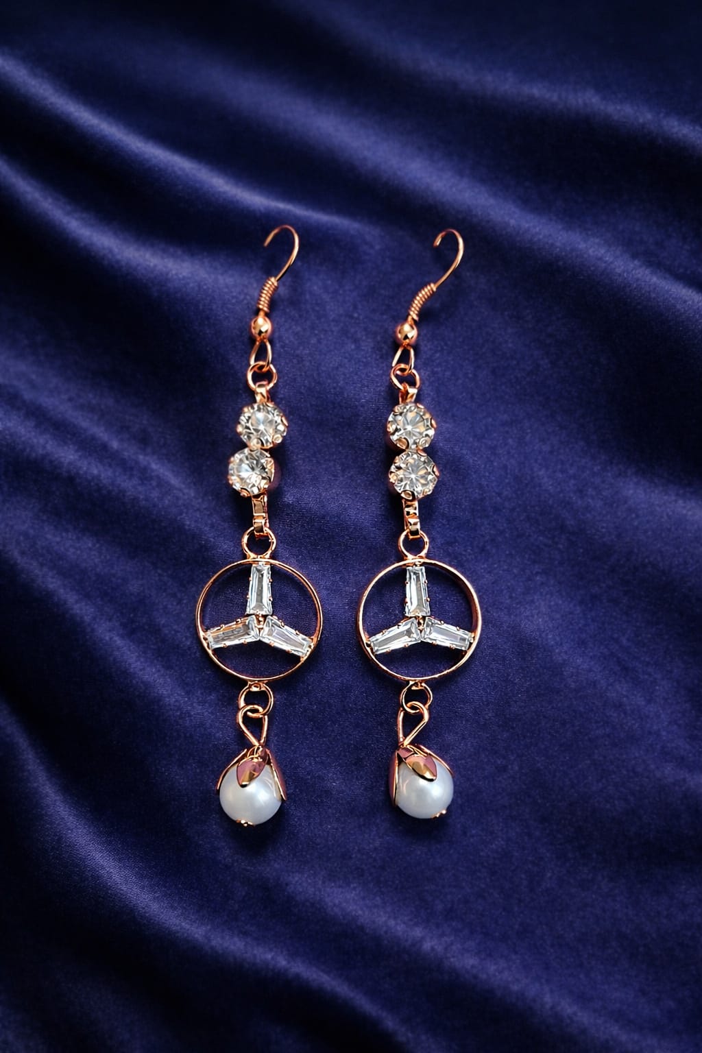 The upper earrings showcase sparkling crystal studs with finely detailed black and gold wings, while the drop earrings are designed with a soft pearl enclosed in a sleek, diamond-inspired frame. The combination creates a balanced look that feels elegant yet contemporary.