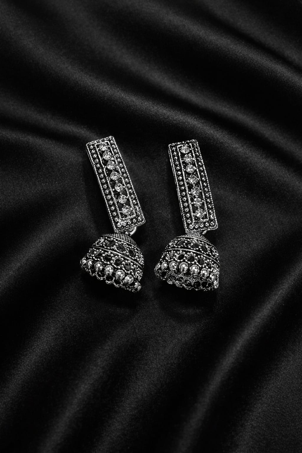 The upper earrings showcase sparkling crystal studs with finely detailed black and gold wings, while the drop earrings are designed with a soft pearl enclosed in a sleek, diamond-inspired frame. The combination creates a balanced look that feels elegant yet contemporary.