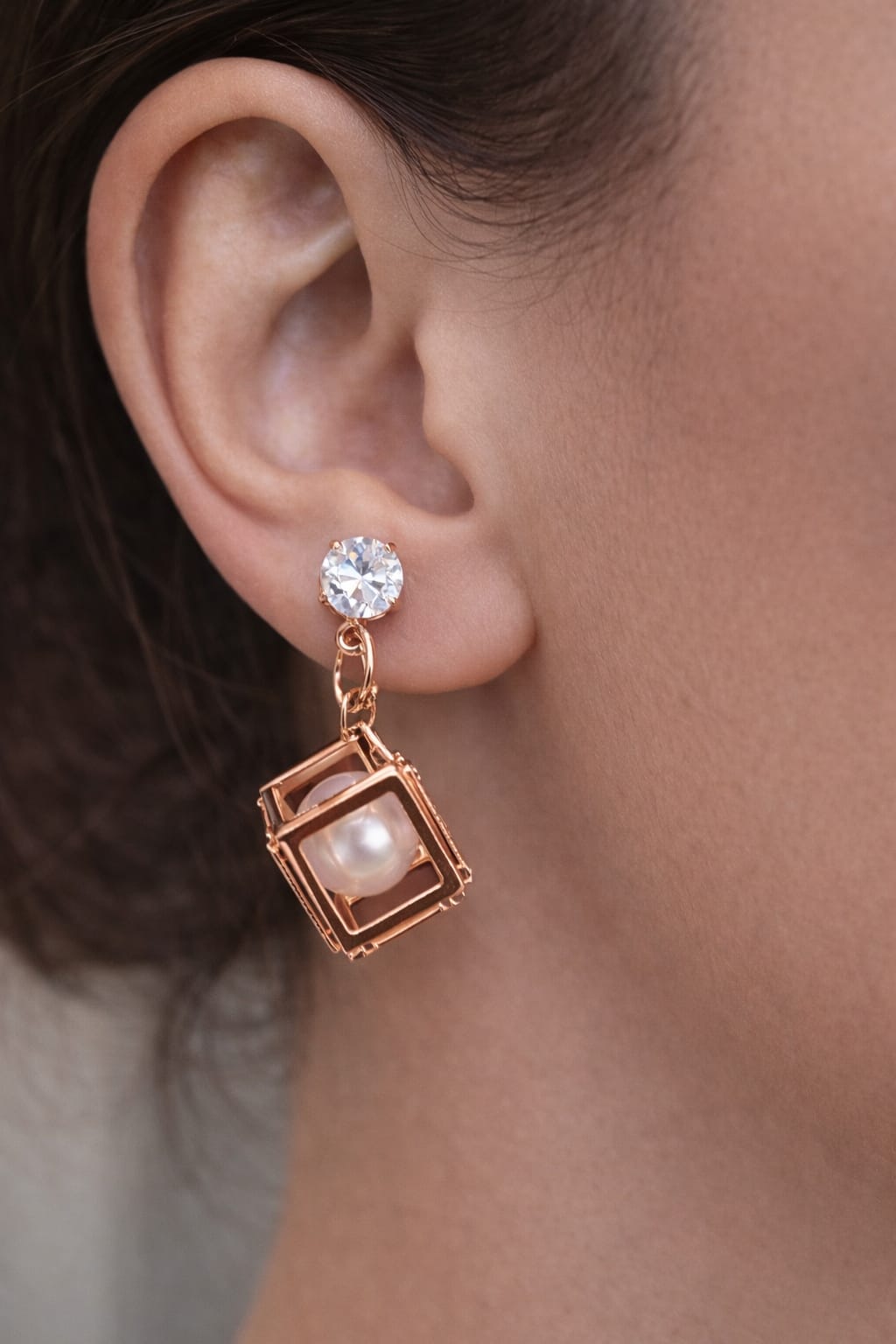 The upper earrings showcase sparkling crystal studs with finely detailed black and gold wings, while the drop earrings are designed with a soft pearl enclosed in a sleek, diamond-inspired frame. The combination creates a balanced look that feels elegant yet contemporary.
