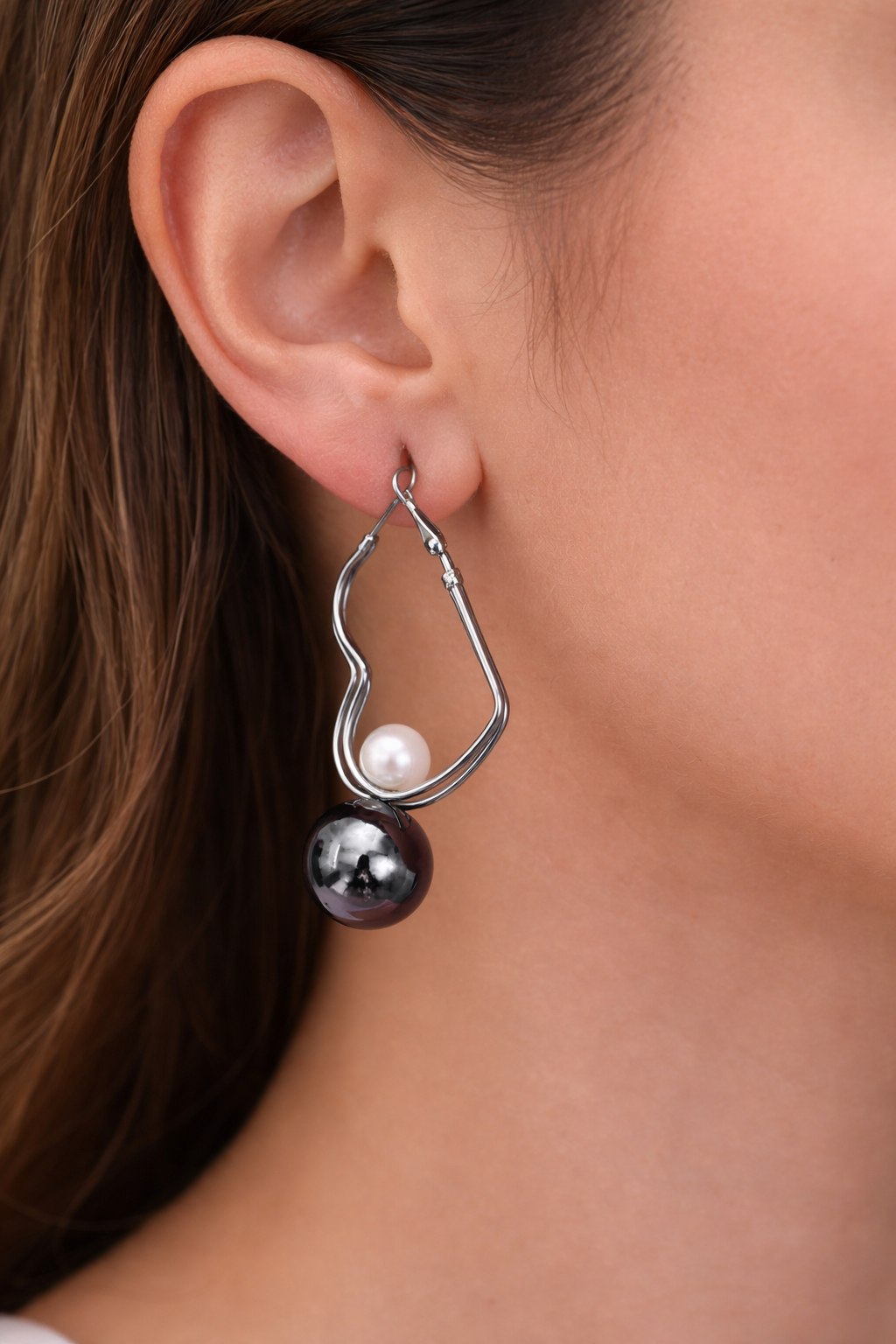 The polished silver-tone frame creates a clean, minimal look, while the contrasting pearls give the earrings a chic statement feel — perfect for elevating both casual outfits and evening styles. Lightweight and stylish, they offer effortless sophistication with a fashion-forward edge.