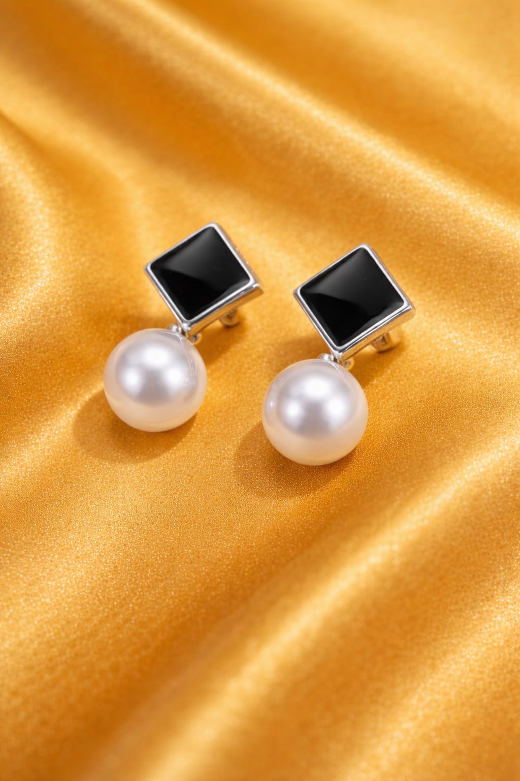 Elevate your elegance with these modern pearl drop earrings, designed to blend classic charm with a contemporary edge. Featuring a sleek black geometric stud framed in a polished silver-tone finish, the design flows into a luminous pearl drop that adds softness and sophistication to every look.